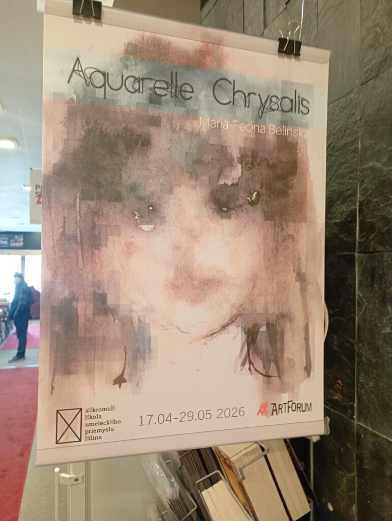 Maria-Feona Belinska je žiačkou 3. ročníka študijného odboru 8604 M grafický dizajn. Na Súkromnej škole umeleckého priemyslu v Žiline študuje od školského roku 2023/2024 ako prvá zahraničná študentka ukrajinského pôvodu. Jej výtvarná tvorba, ktorá sa rozvíja pod vedením pedagógov našej školy, potvrdzuje výrazný talent, cit pre farebnosť a osobitý autorský rukopis. Napriek názvu Aquarelle Chrysalis ide o skutočné ručné maľby, vytvorené technikami akvarelu a uhlíka. Autorka v nich citlivo pracuje s figúrou, ktorú zachytáva v jemných lazúrnych tónoch. Diela pôsobia krehko a zároveň výrazovo presvedčivo, pričom naznačujú proces premeny a vnútorného napätia.